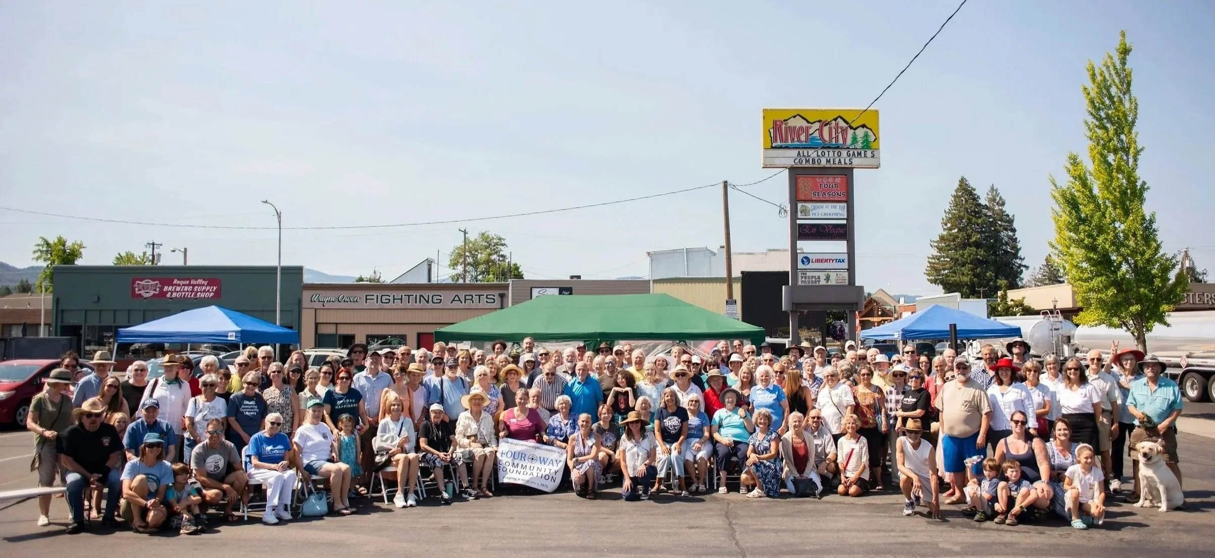 Library leaders and community members celebrate the purchase of the New Grants Pass Library property in 2023.